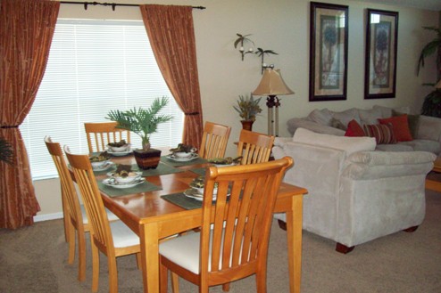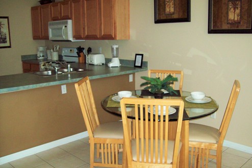 silverware .The adjacent breakfast area has table & chairs for