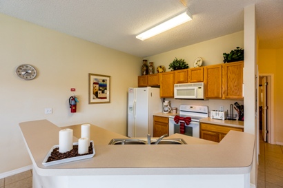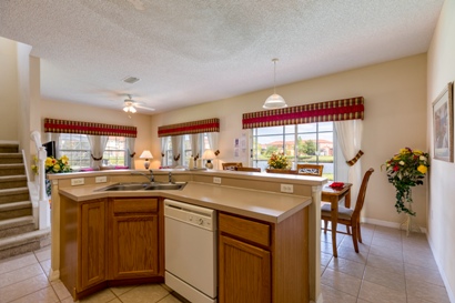 The well equipped kitchen with dishwasher, microwave, stove, coffee maker, toaster, blender, all pots, pans, silverware, table ware and plastic ware for the pool area is provided.