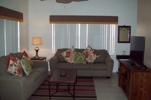 sofa and love seat, Flat screen TV, DVD and ceiling fan. The