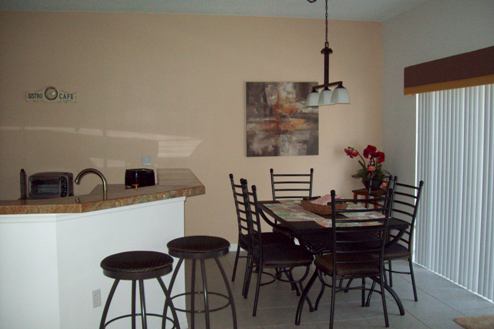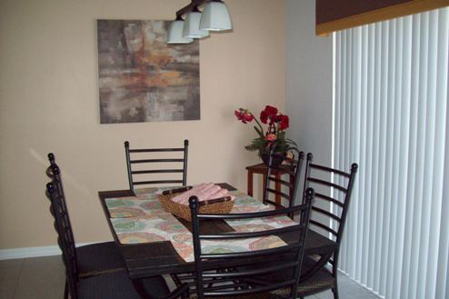 adjacent dining area with table and chairs with seating for
