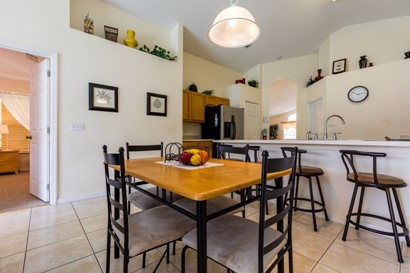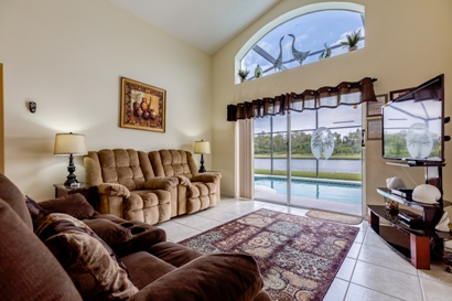The breakfast area is adjacent with seating for casual dining and bar stools this area overlooks the spacious family room also fully tiled with flat screen TV, DVD & CD player the family room overlooks the pool /Spa deck area with table chairs & sun loungers with stunning lake view.